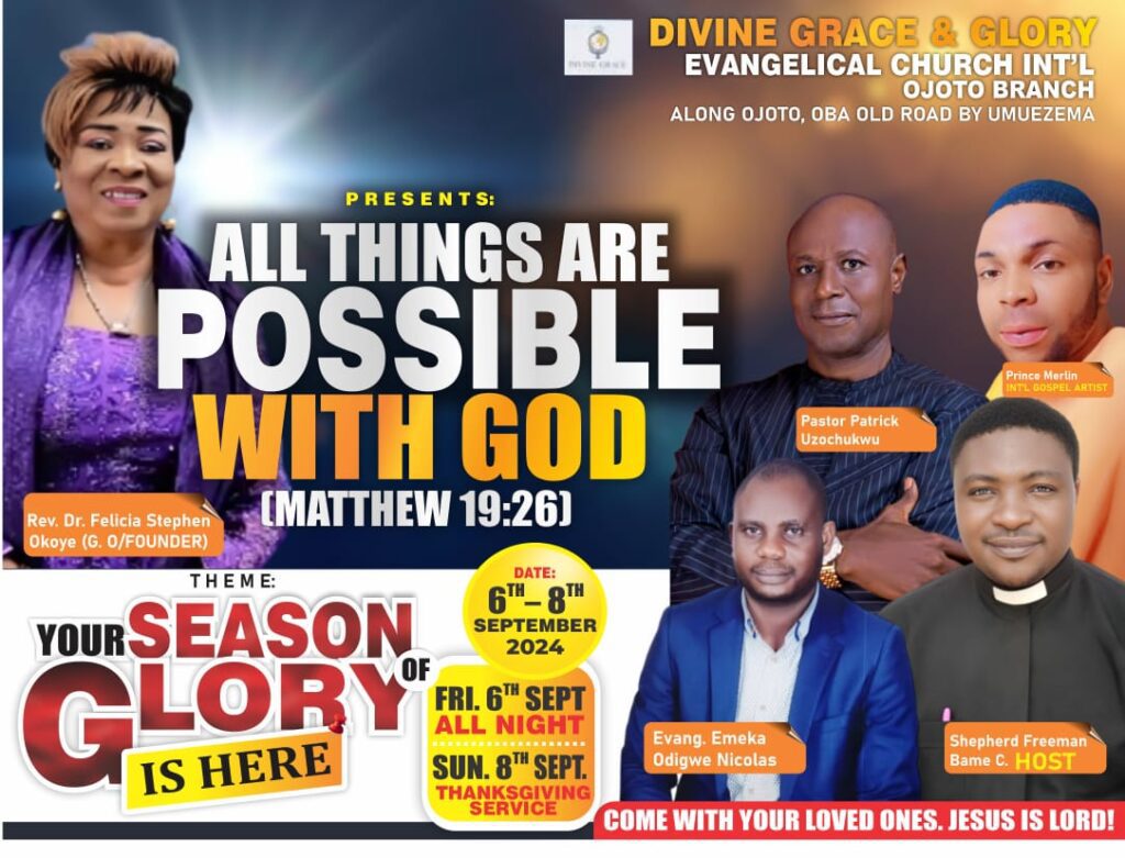 Divine Grace Ministries International is a mandate given by God to his humble handmaiden Rev. Dr. Mrs. Felicia Stephen-Okoye in 1991 to embrace love and care for the reproached, hurting, wounded and often stigmatized people in the society.